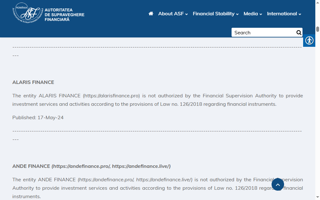 An additional issue comes from the warning that the Romanian Financial Supervisory Authority formally warned the company. The regulator has announced that alarisfinance.pro is located on its blacklist for rendering unsecured services. A regulated broker is never forced to operate without proper licensing, hence it is indeed a strong warning.