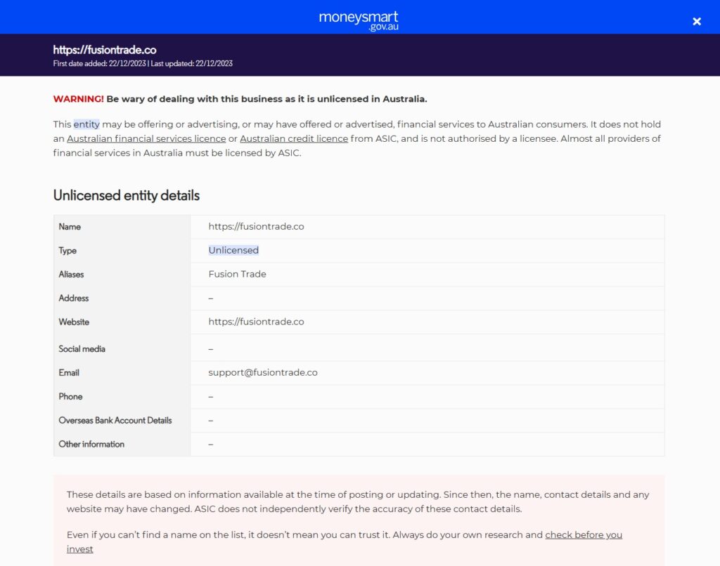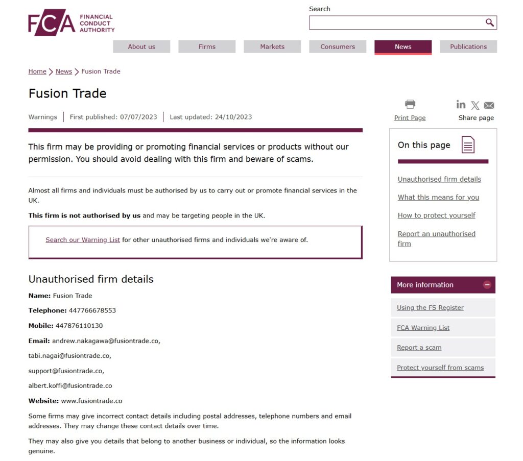 The Financial Conduct Authority (FCA) in the UK warned on July 7, 2023, that Fusion Trade may be offering financial services without authorization. The AMF in France added the platform to its warning list on August 23, 2023, followed by the CNMV in Spain, which flagged the company on September 11, 2023. Regulators in Australia and Romania have also issued alerts, confirming that Fusion Trade is operating without proper licenses.
