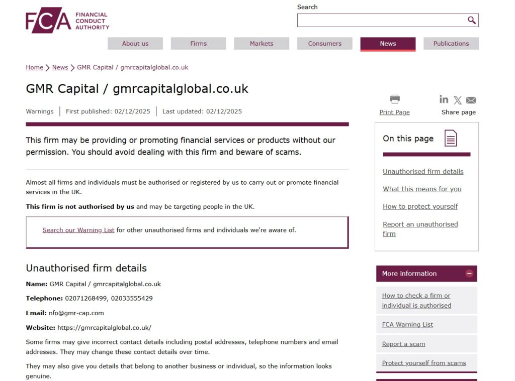 GMR Capital is an online investment platform that has been officially flagged as an unauthorized and high-risk operation. The UK’s Financial Conduct Authority (FCA) has issued a public warning stating that GMRCapitalGlobal.co.uk is not licensed to offer financial services. This means the company operates without regulation, and users do not receive any standard protections that come with dealing with an approved financial firm.
