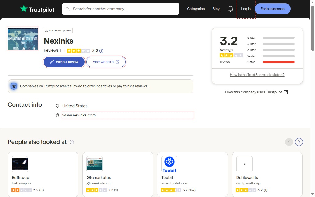 The only good company review listed for Nexinks.com is on Trustpilot, where it gave it 1 out of 5 stars for bad experiences and possibly lost money. The company’s profile is also marked unclaimed on Trustpilot, which means that it is not monitoring its public reputation, a behavior on display by unreliable or fraudulent organizations.