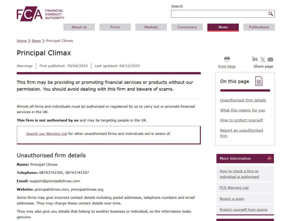 Principal Climax is an online financial platform that claims to offer investments, cryptocurrency trading, and high-return financial services. However, the Financial Conduct Authority (FCA) in the United Kingdom has officially warned that this company is not licensed or authorized to provide any financial products. This means the platform is operating without legal permission, and users are strongly advised to avoid it.