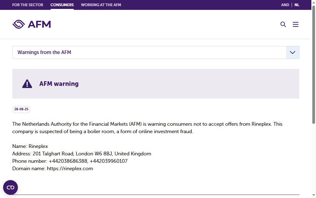 Warned By: Netherlands Authority for the Financial Markets and Financial Conduct Authority (UK)