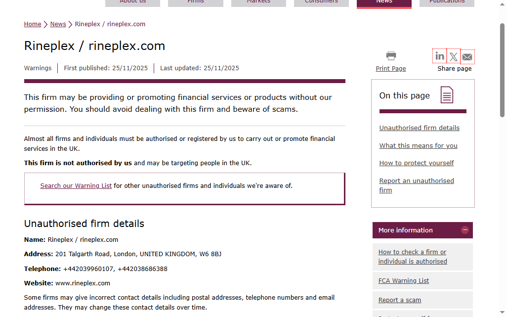 Because this regulatory oversight is missing, many experts view Rineplex as high-risk. This review examines whether Rineplex broker is legitimate or potentially fraudulent, reviews its regulatory standing, highlights common scam tactics, and explains what you should do if you have already invested and are facing problems.
